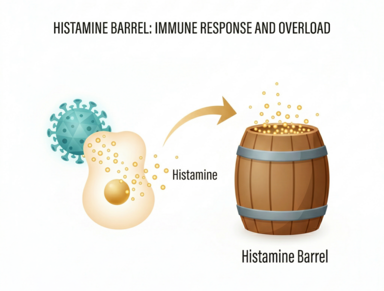 Histamine is actually a hero in this scenario; it helps dilate blood vessels so immune cells can get to the site of the infection faster. However, if you already have Histamine Intolerance, your “Histamine Bucket” is likely already near the rim. When the immune system dumps a massive amount of endogenous (self-produced) histamine into the mix to fight a cold, the bucket overflows instantly.